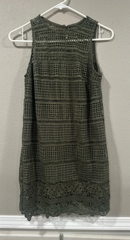 Chic olive green sleeveless dress with intricate crochet design. Perfect for casual outings or summe... Show more
