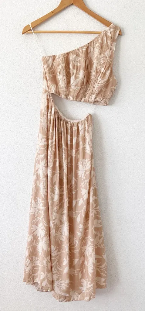 size S. Sleek cutout waist and a flowy, feminine silhouette. Crafted in a neutral tan floral print,... Show more