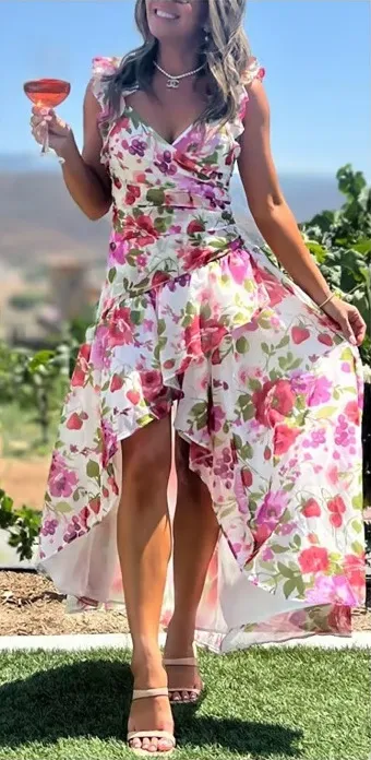 Chic high-low dress with vibrant floral pattern. Perfect for stylish outings.