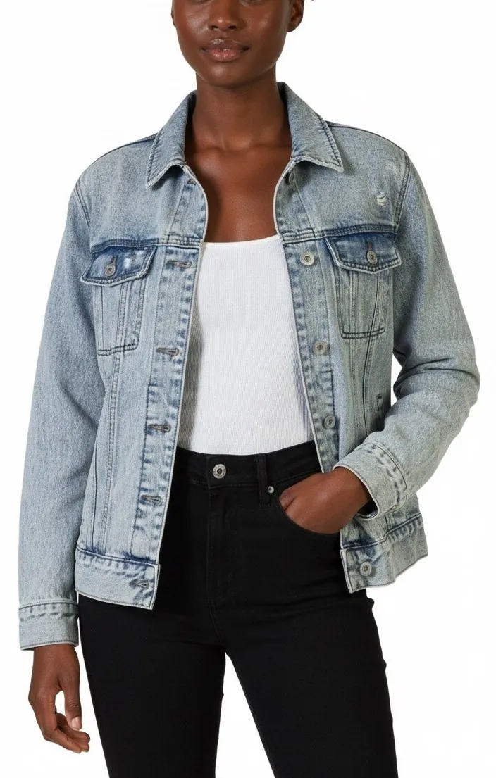 Button front closure Point collar Long sleeves Rigid 100% cotton denim Stone wash Light distressing... Show more