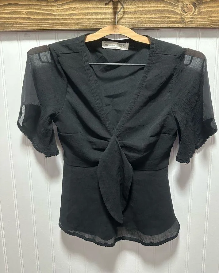 This chic black blouse from Abercrombie & Fitch features a stylish wrap design and a notched collar,... Show more