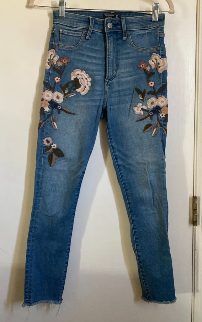 Abercrombie & Fitch Simone Short Hi Rise Ankle Embroidered Floral Denim Jeans Medium Wash 5 Pocket S... Show more