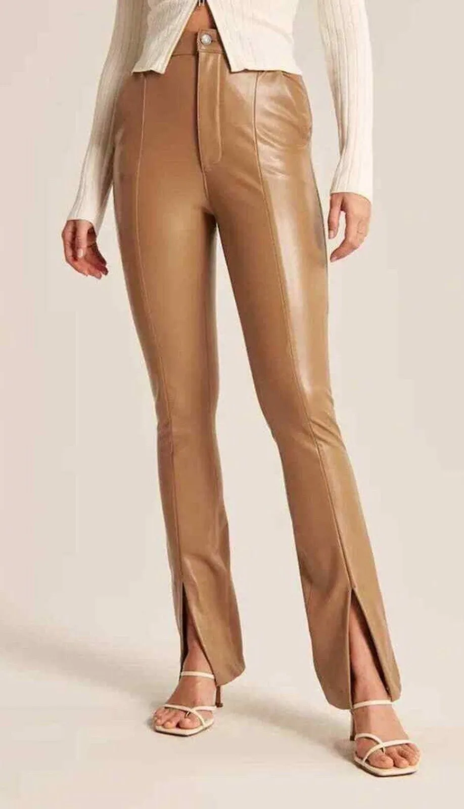 Abercrombie & Fitch Skinny Ultra High Rise Faux Leather Split Hem Pants in light camel brown, size 4... Show more