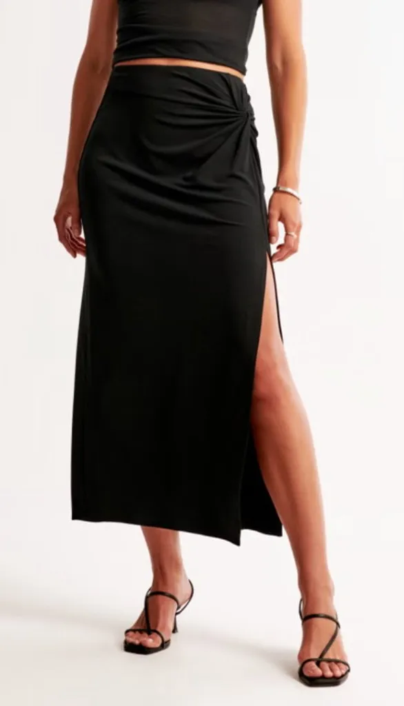 Abercrombie & Fitch Knotted Midi Skirt in the color Black. Knotted detailing, high side slit, hidden... Show more