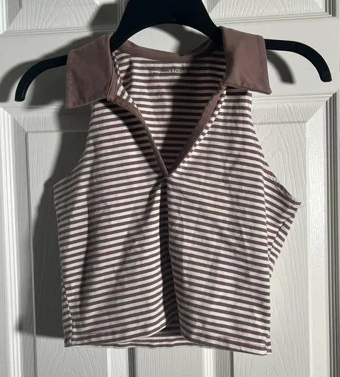 Stylish sleeveless top with a collared design. Features brown and white stripes. So adorable, just n... Show more