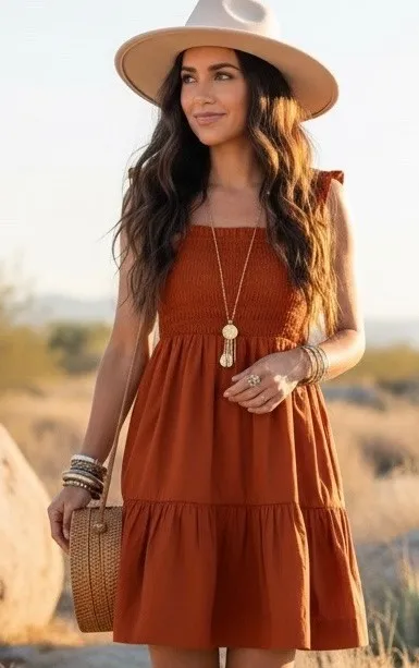 Condition: Gently used with no flaws Color: Burnt orange rust Size: Small Regular length Smocked b... Show more