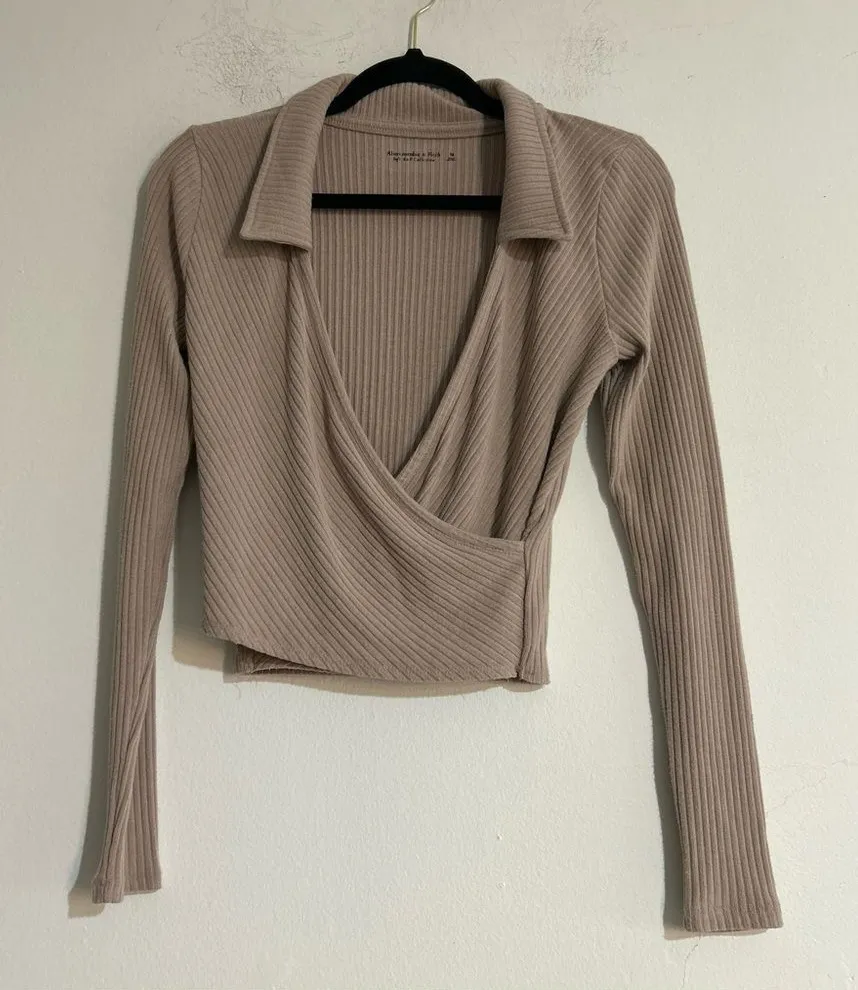 Long sleeves Pullover Plunging v-neck Collared rugby style Ribbed fabric Faux wrap Materials tag cut... Show more