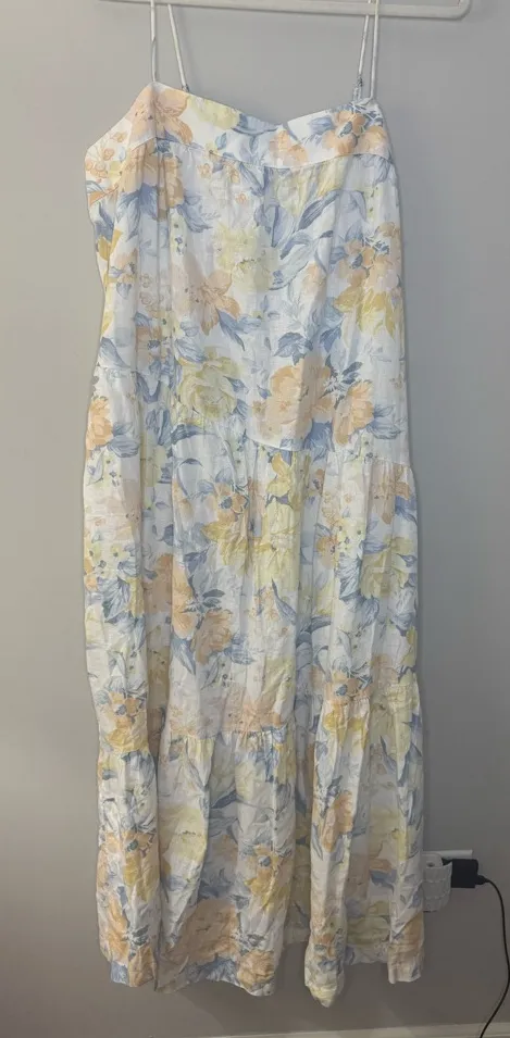 Chic strapless dress with floral pattern. Features soft blue and yellow hues. Ideal for casual outin... Show more