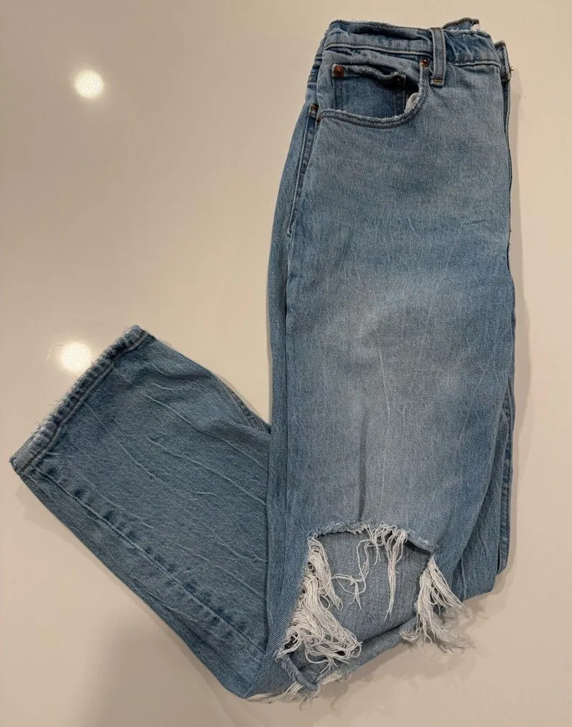 Classic light blue denim with a high rise. Features a straight fit for everyday comfort. Abercrombi... Show more