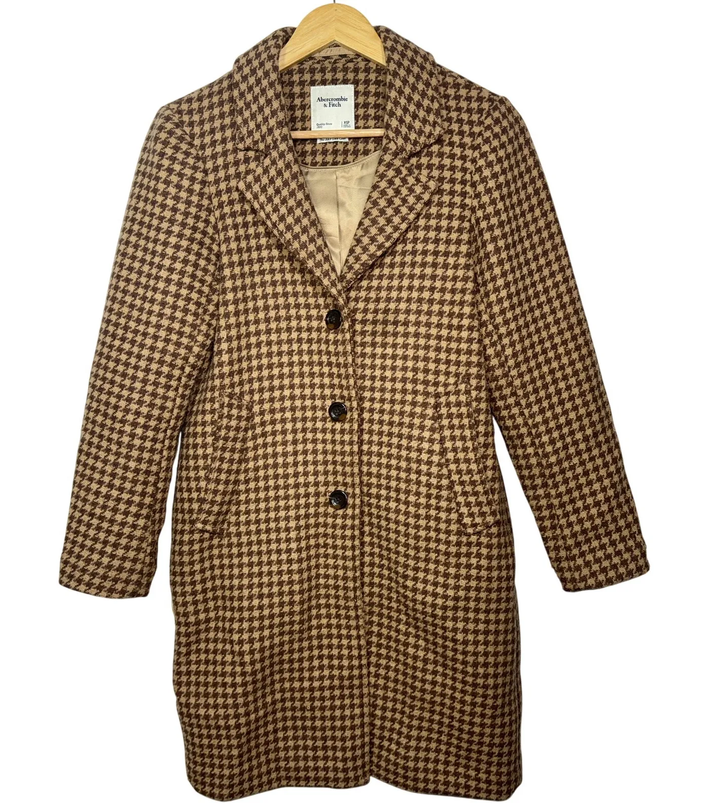 Abercrombie & Fitch The A&F Dad Coat Tan Brown Houndstooth Wool Blend Long Button Front Overcoat Womens Size XSP (Extra Small Petite)
