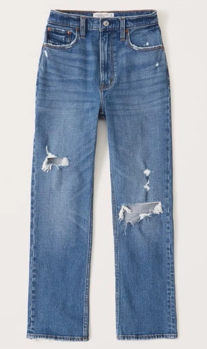 Ultra high rise ankle jeans in a straight and relaxed fit through the calf featuring a medium ripped... Show more