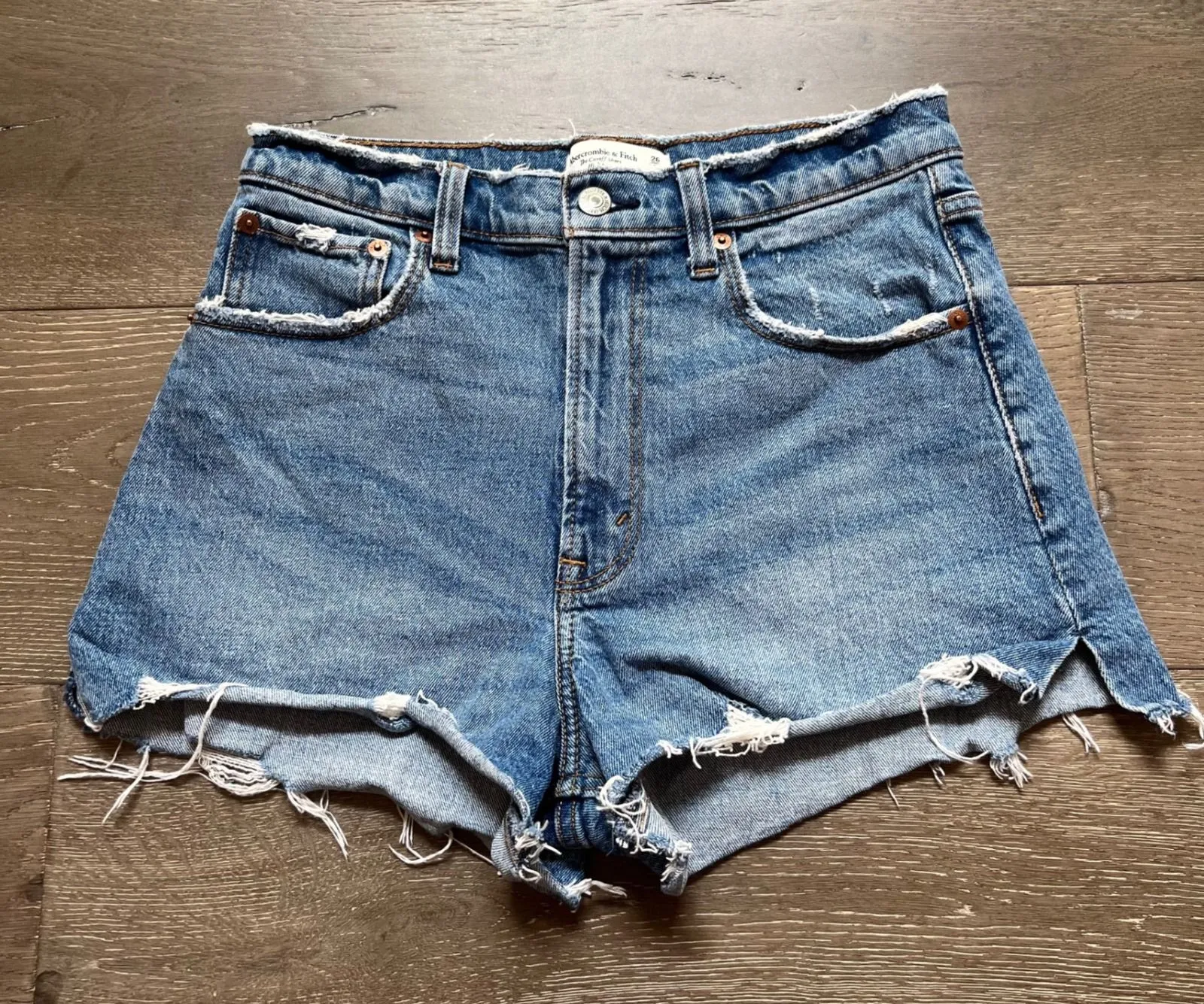 Keywords: Abercrombie & Fitch, denim shorts, high rise shorts, cutoff shorts, jean shorts, womens shorts, size 26, frayed hem, casual shorts, summer shorts, light wash denim, the cutoff short, a&f shorts