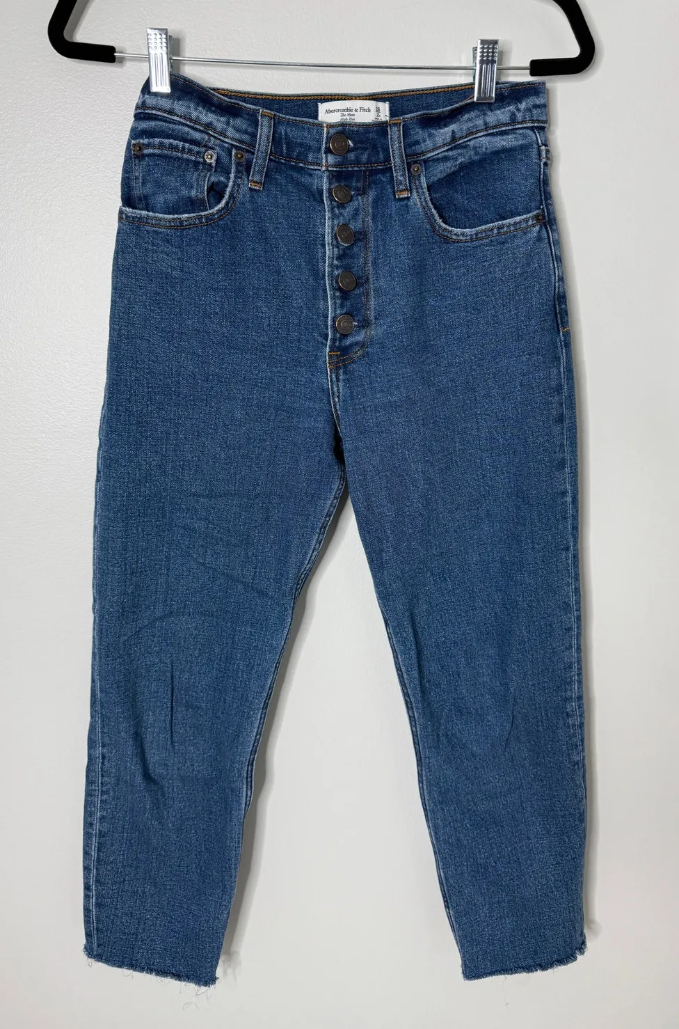 Abercrombie & Fitch The Mom High Rise Button Fly High Rise Raw Edge Ankle Jeans 26/2S Medium Dark B... Show more
