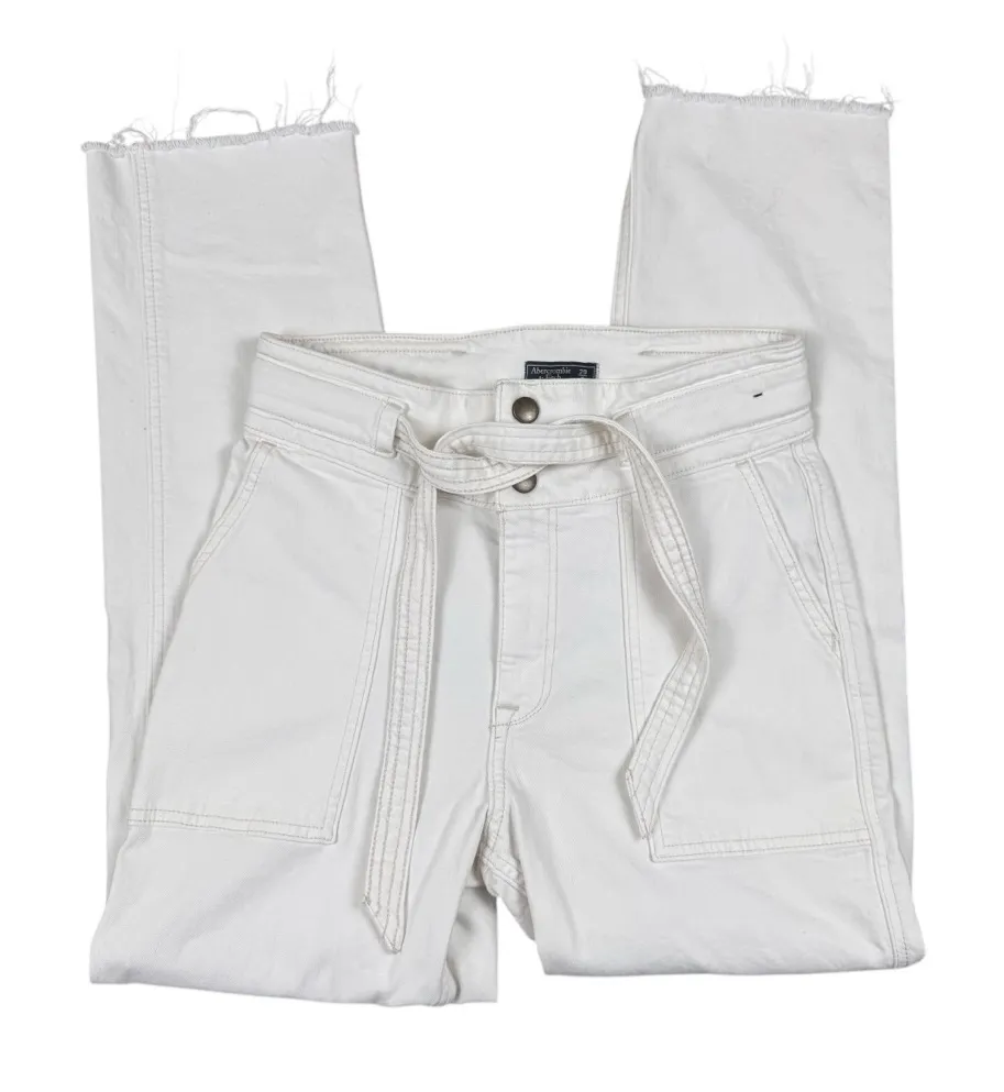 Stylish ultra high rise off white jeans Features a tie belt Factory frayed hem for a trendy look Per... Show more