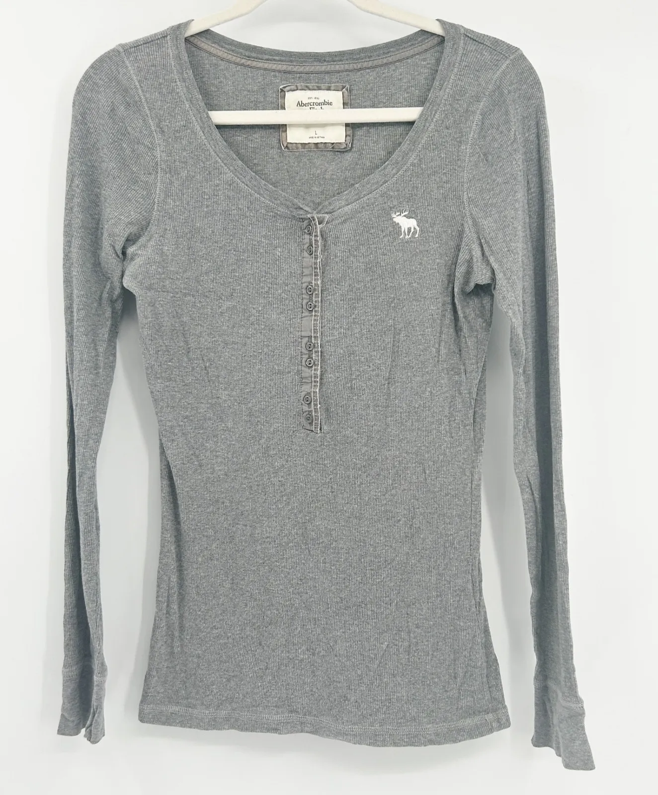 Keywords: Abercrombie & Fitch, Long Sleeve, Henley Shirt, Gray Top, Womens Top, Ribbed Knit, Casual Top, Comfortable, Everyday Wear, Moose Logo, Crew Neck, Cotton Blend, Twilight, Bella Swan, Y2K, Vintage, VTG, 2000s