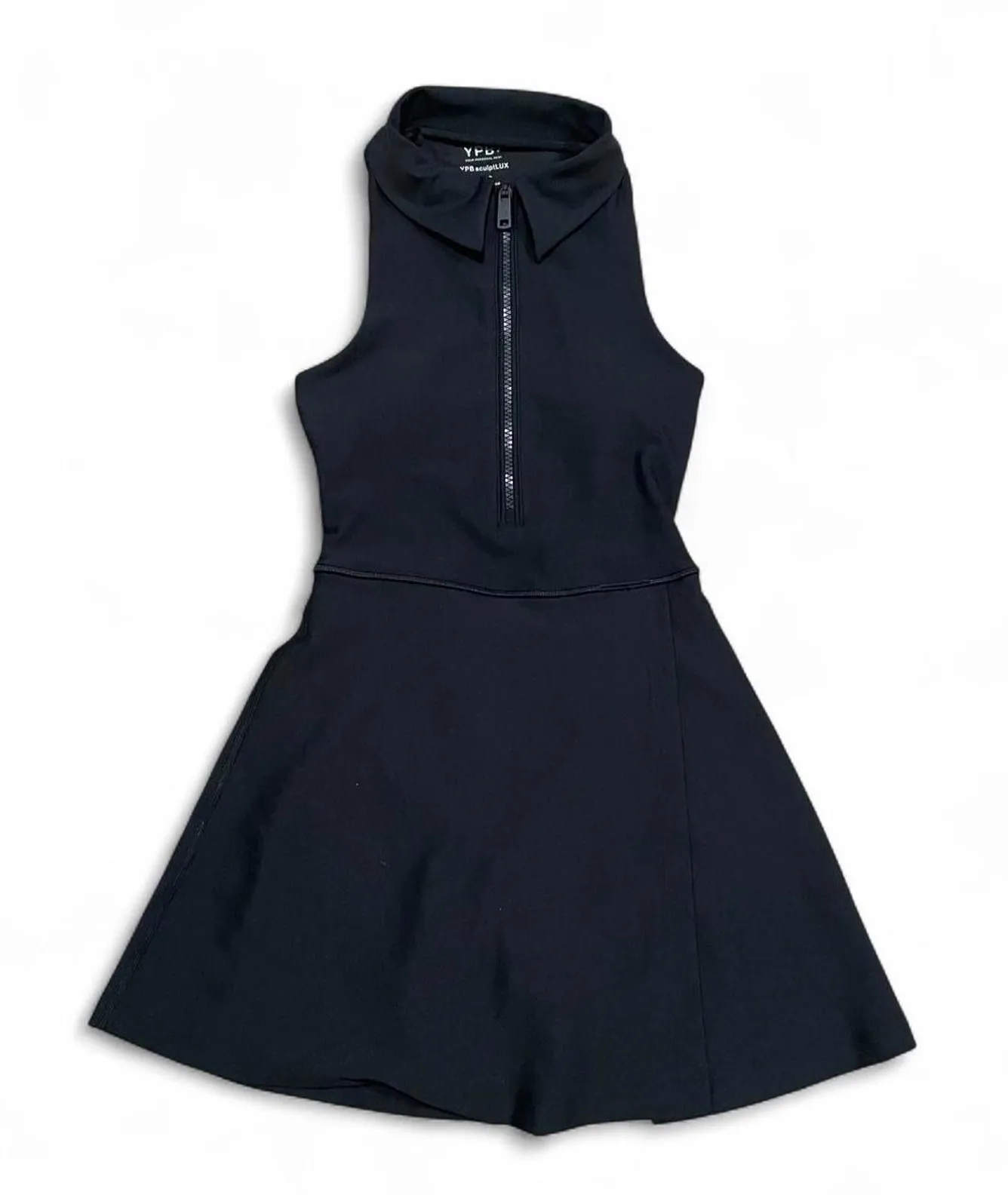 Black mini dress with zipper neckline and side zipper closure. cutouts in the back. collared. the wr... Show more