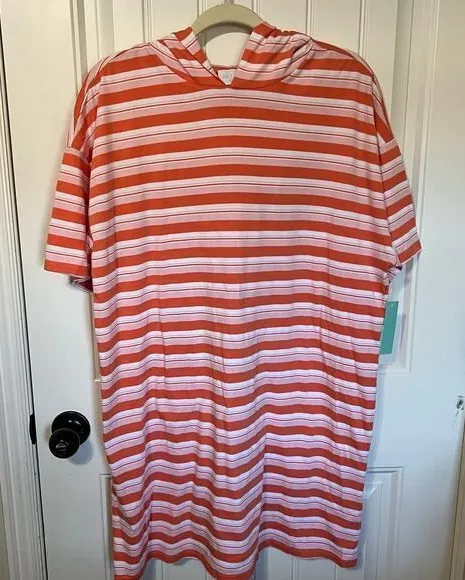 Striped hooded cover-up, perfect for throwing on over your swimsuit. Features a relaxed fit, short s... Show more