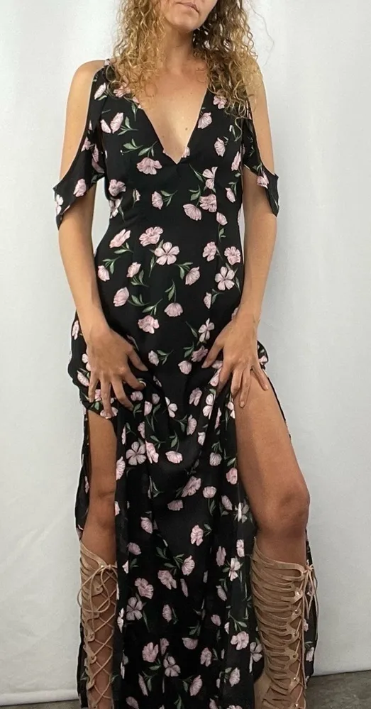 About Us Floral Side Slits Maxi Dress in Black Multi Size Small Excellent Used Condition Side slits V neck V back Cold Shoulder design Open sides Lined Revolve style No trades, offers welcome!