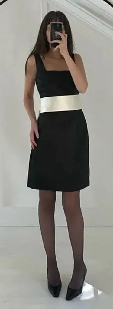 ABS Allen Schwartz Collection black/ivory, solid, sleeveless, square neck, mini dress. Stunning retro aesthetic, vintage Y2K. Midweight satin fabric construction with contrasting affixed waist sash & oversized bow accent at back. Square neckline & open, low cut square back. Slim, classic fit, mini length silhouette. Concealed side zip closure. Fully lined. Made in USA. Excellent condition. Self: 100% polyester Lining: 100% acetate Bust: 30.5” Waist: 26.5” Length: 34.25” --- E4654
