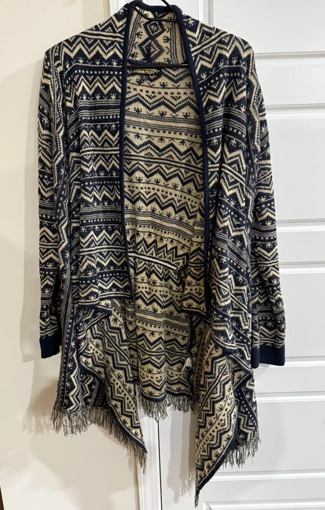 Excellent preowned item. The cardigan has an open-front, waterfall design with a southwestern or Aztec print. Details: It features a fringe or tasseled hem. Material: 100% acrylic. Color: Navy blue and beige