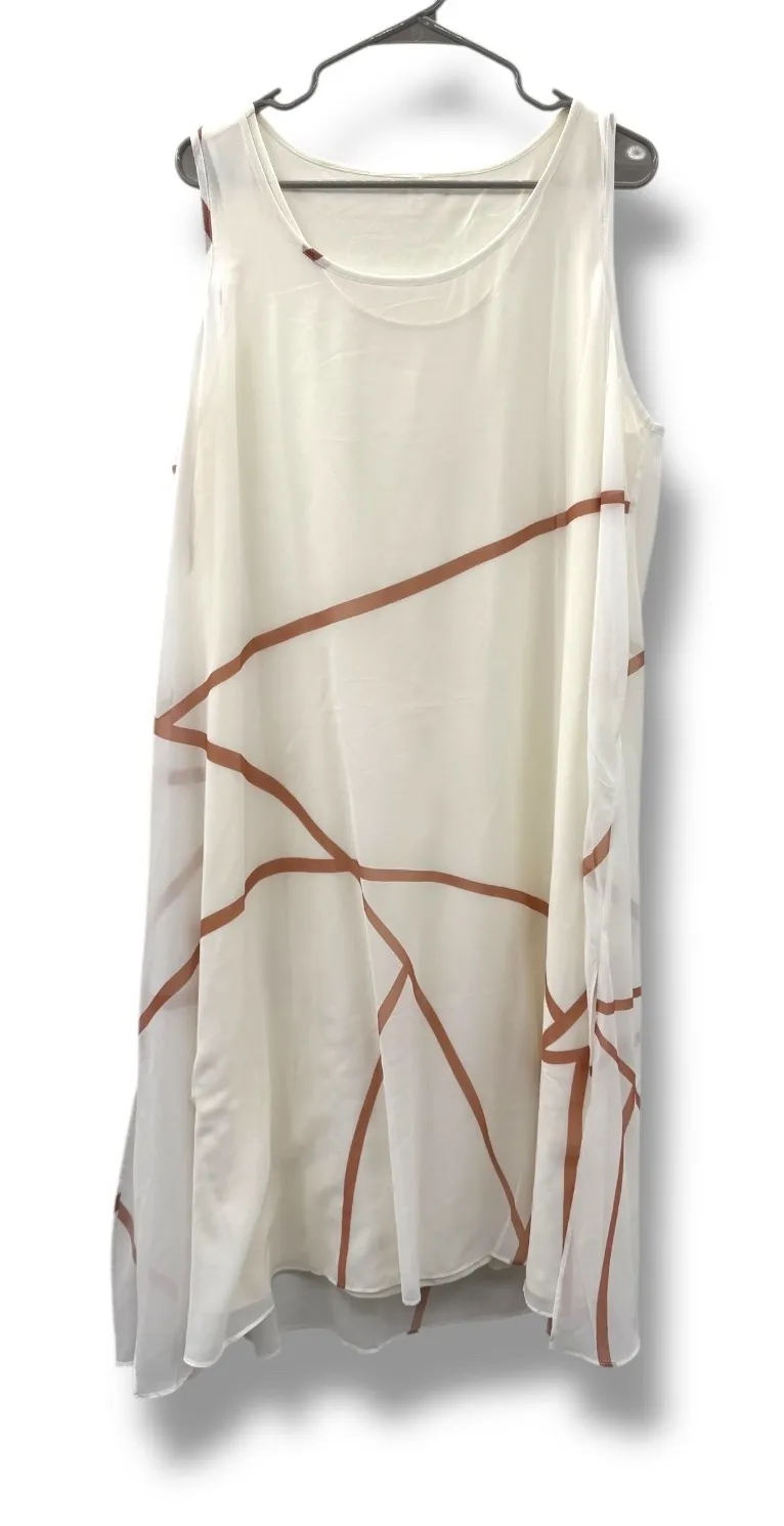 Effortlessly artistic and modern, this ivory sheer overlay dress features an abstract line print and a relaxed, flowy silhouette perfect for layering. Designed with a sleeveless cut and lightweight drape, this piece embodies the minimalist lagenlook aesthetic—ideal for creative wardrobes, resort styling, or elevated everyday wear. Details Two dresses - one base that is ivory/cream then the sheer abstract overlay Color: Ivory / cream with brown abstract line print Lightweight, airy fabric with fluid movement Layered / overlay design (sheer outer layer) Flowy, relaxed silhouette Scoop neckline Lagenlook / minimalist / artsy style Size: No size or brand tag, estimated to be an XL, see measurements please Condition: Excellent Approx. Measurements: • Bust: 23 in • Waist: 27.5 in • Length: 45 in lagenlook, sheer overlay dress, abstract dress, minimalist dress, artsy clothing, boho layering, flowy dress, oversized dress, modern minimalist, resort wear, neutral dress, statement layering piece