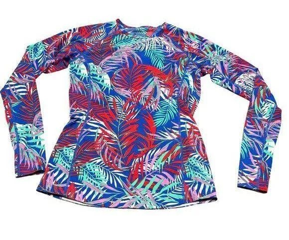 Style 03273 Beach, summer, pool, surf, surfing, vacation, tropical, hawaiian Royal Blue with red, teal, mauve and white leafy pattern all over. Grip piece at the bottom on the back to keep it in place Polyester Excellent UV Protection Excellent Used Condition Flat pit to pit: 17" | Length: 23"