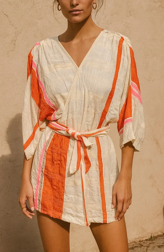 This Ace & Jig tunic dress features a belted waist and bold cream, orange, and pink striped pattern,... Show more