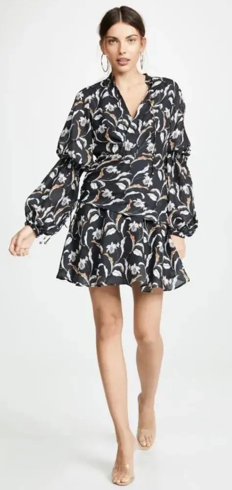 Acler Zammit Floral Printed Mini Dress in Blue Cattleya Orchid This Acler Zammit Printed Mini Dress features floral print throughout, tiered ruffle accents at waist and sleeve opening. Band collar with attached ties Crossover V-neck Long caught balloon sleeves with stretch-smocking at elbows Elasticized cuffs Draped faux-wrap front Seamed waist Asymmetric skirt overlay with ruched right side seam Inverted back pleat Allover floral print Concealed side zip closure Partially lined Composition: 100% polyester **One small run shown in last photo Size US 6 Armpit to armpit is approx 19" Waist is approx 16" Hip is approx 25" Length is approx 36" Ready for a new home ♻️ Feel free to ask any questions! _____________ About Spin + Thrift *Accepting all reasonable offers. *We ship same or next business day. *Smoke free home. *Shop with confidence over 5500+ 5 star ratings, *New items added daily!