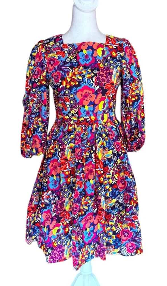 Excellent condition no issues. 100% cotton. Back zipper. No size tag but fits like an XS or Small. Not much stretch. Please see photos of measurements to verify fit. Tags: colorful floral cotton summer spring vacation puff sleeve