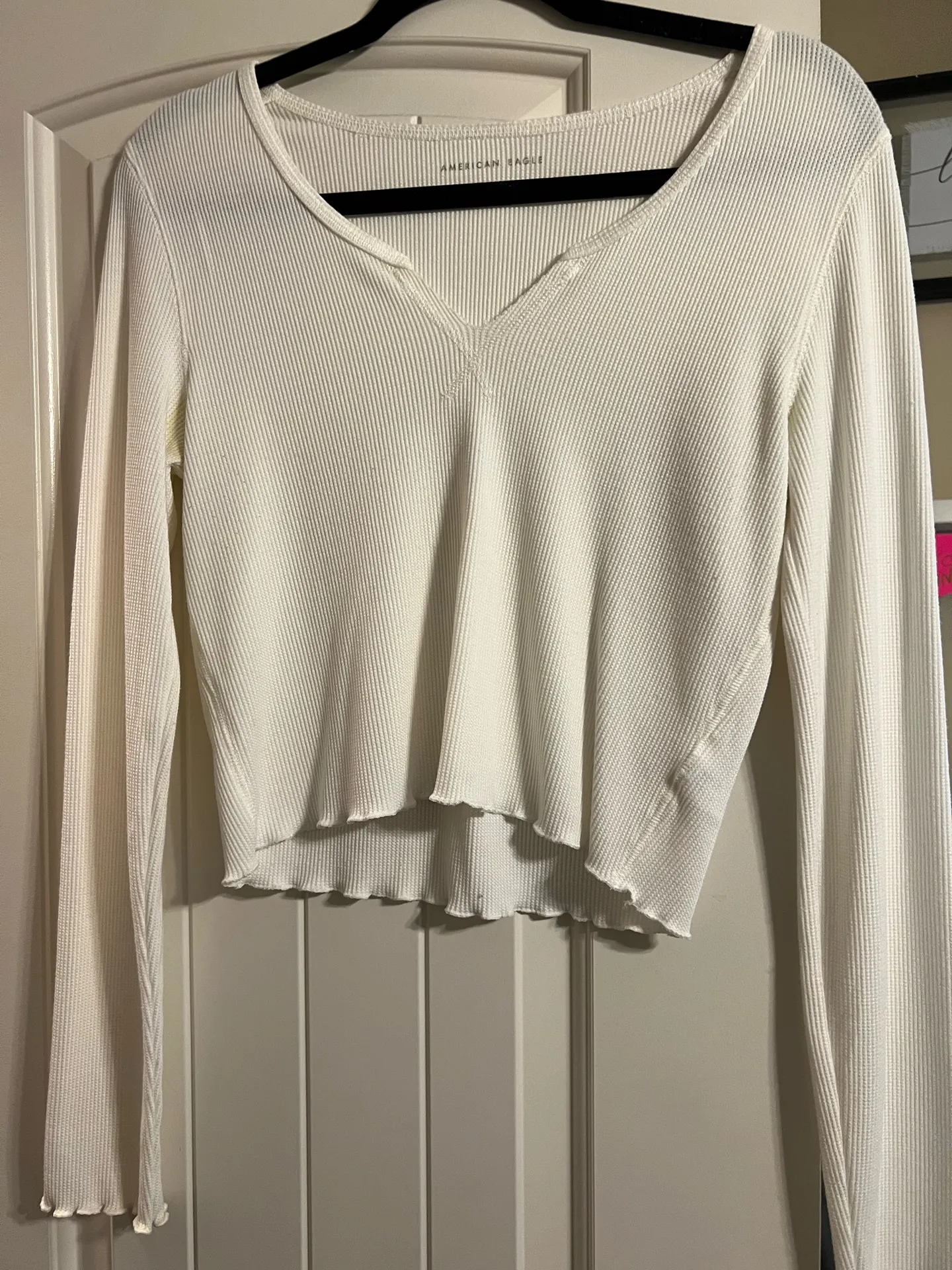 pretty cropped, really cute lettuce trim on the hem and sleeve!