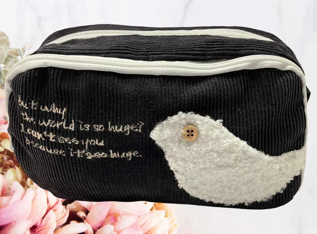 The Adante iMark Black Corduroy Pouch is a rare find featuring a fuzzy white bird , adding a unique touch to this small zip pouch. Made in Japan, the exterior is crafted from corduroy material with a black lining. The pouch has a solid exterior color with a white bird character accent, making it a versatile accessory for travel, casual, or business occasions. With two zip pockets and a zip closure, this stylish zip pouch is perfect for women looking to add a charming and practical piece to their collection. Product Code: A7AU-06/CG Barcode Number: 4536047020207 Material: Corduroy outer (100% cotton), Nylon lining (100% nylon), with embroidery and appliqué. •Condition: New, with tags. •Shipped with care! Will generally go out same or next business day. •Please read the description and review all photos of the item to ensure the condition/ fit meets your expectations. •Price is Firm. THANK YOU FOR VISITING MY CLOSET!