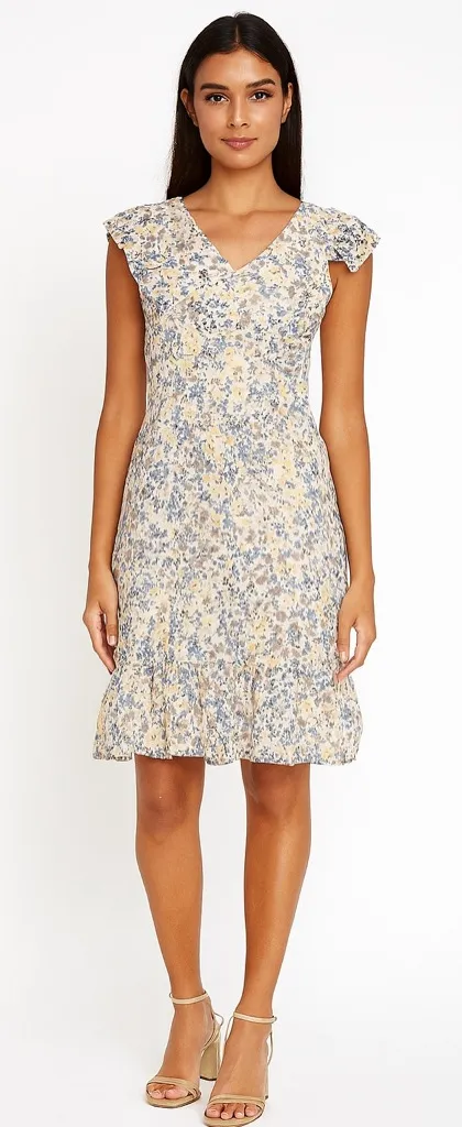 Charming floral mini dress featuring a delightful mix of style and comfort. This sleeveless dress showcases a flattering V-neckline and playful ruffle detailing that cascades down the front, adding a touch of whimsy. The all-over floral print in soft hues creates a fresh and airy feel, perfect for warm weather. The dress is designed with an open back and a ruffled hemline, enhancing its feminine silhouette. Style: Wrap Dress, Sundress, Fit & Flare, Mini, A-Line Dress Length: Short Color: Multicolor Department: Women Sleeve Length: Sleeveless Pattern: Floral Occasion: Casual, Party/Cocktail, Travel Material: Polyester, Polyester Blend Neckline: V-Neck Character: Daisy, Flower Girl, Summer, Party Girl Fabric Type: Chiffon Ask for measurements! Shop: tees, shorts, skirts, rompers, jeans, Linen, cotton, workout, aesthetic athletic clothes, striped, cut-off, jumpers, heels, career, resort, vacation, swim, beachy, summer, fall, work, lounge, cashmere, chic