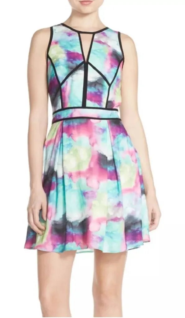 Adelyn Rae Water Color Fit and Flare Sleeveless Mini Cocktail Dress Size L Water colored Fit and Flare mini dress features bold banding and sexy cut out back Scoop neck Cutouts on front and back Black trim throughout Fully lined Side zipper 100% Polyester #051 Length 36 Chest 19 Waist 16