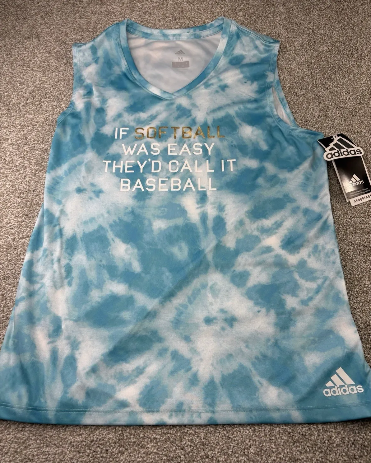 Brand new with tags Adidas AEROREADY women's softball tank top. Blue tie-dye design with gold and w... Show more