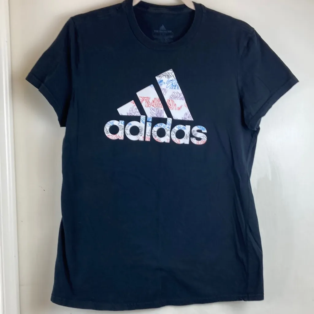 Adidas Black with White & Floral Adidas Logo Short Sleeve Shirt The Go-To-Tee Good Condition White... Show more