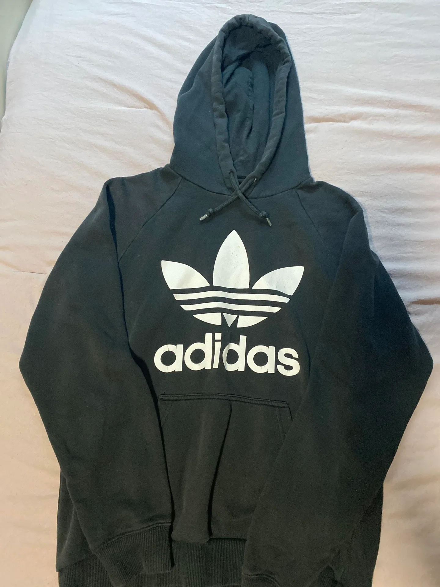 black and white adidas hoodie in size medium. sized for men. some distress on the logo from wear but... Show more