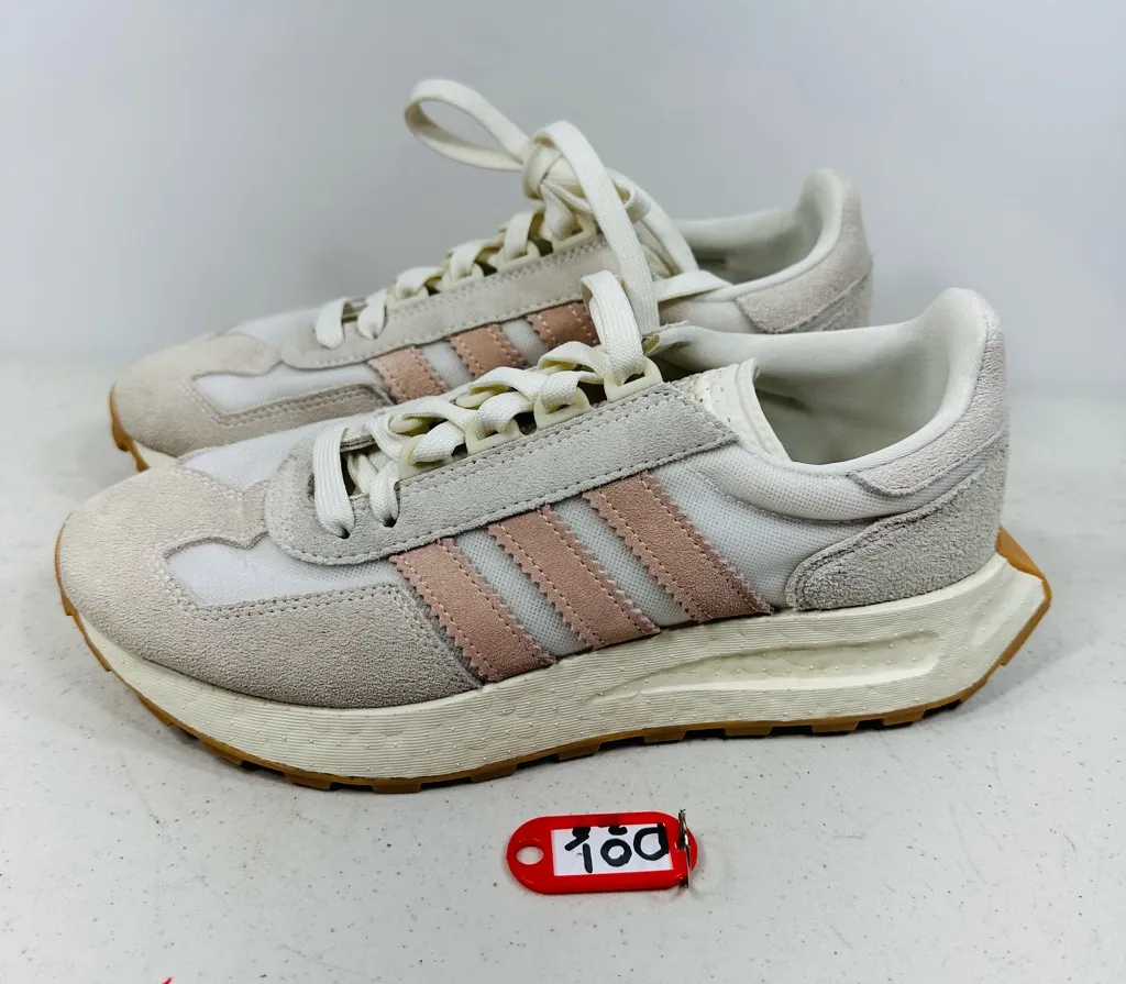 Stylish Adidas sneakers with a cream and pink design. Perfect for casual wear.