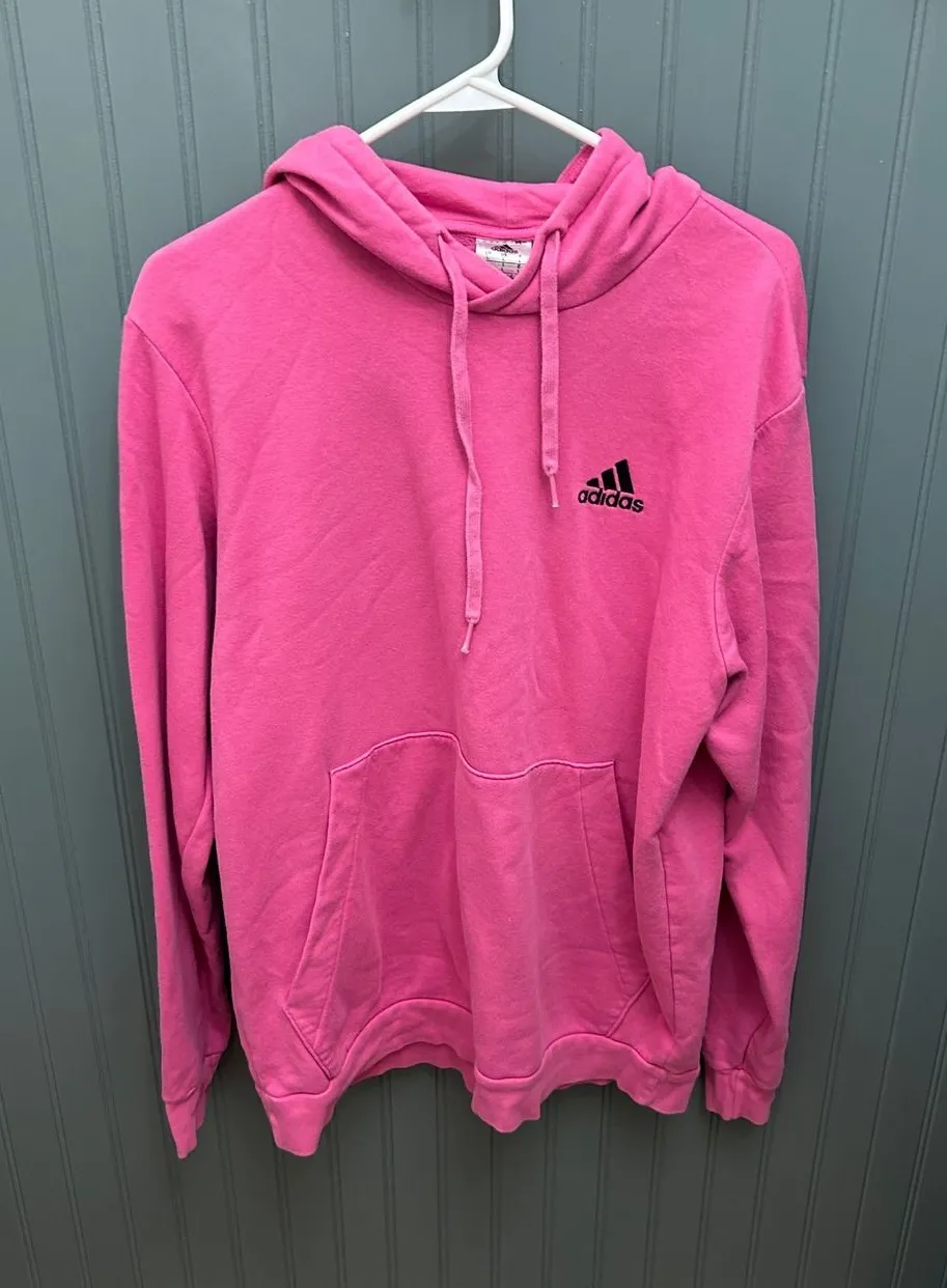 Keywords: Adidas hoodie, pink hoodie, womens hoodie, pullover sweatshirt, embroidered logo, activewear, casual wear, athletic hoodie, sports apparel, large hoodie, comfortable hoodie, cotton blend hoodie, pink sweatshirt