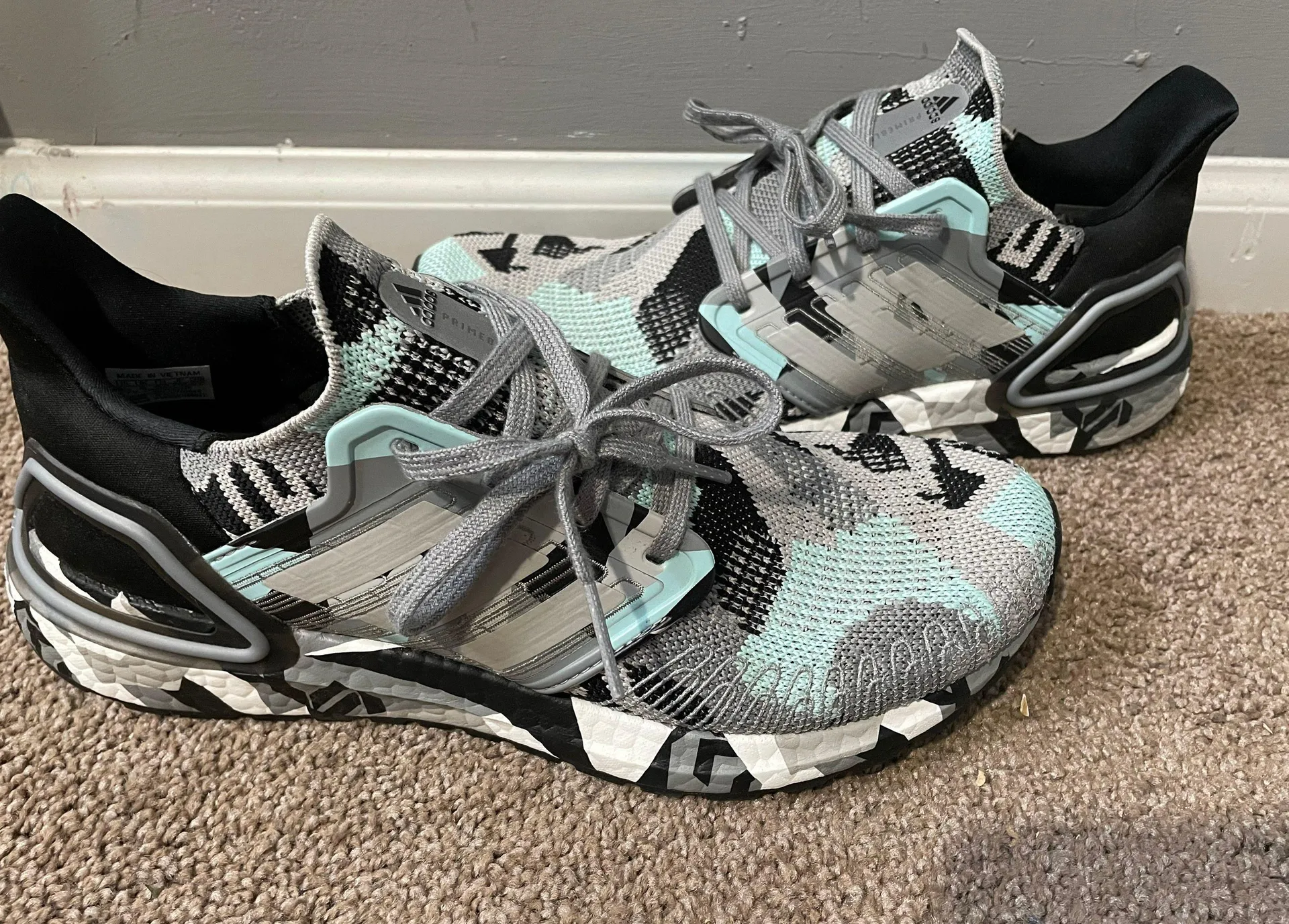 Grey, light blue, and black. Size men’s 8.5, women’s 10. Really good shape, super comfy!
