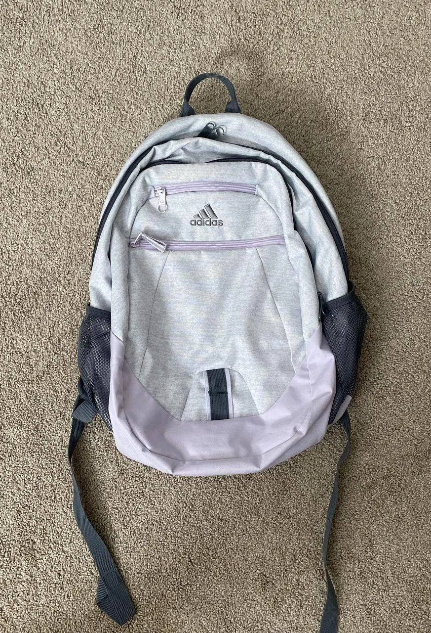 Purple and grey Adidas backpack • bottom is a little dirty but barely noticeable • used for one sc... Show more