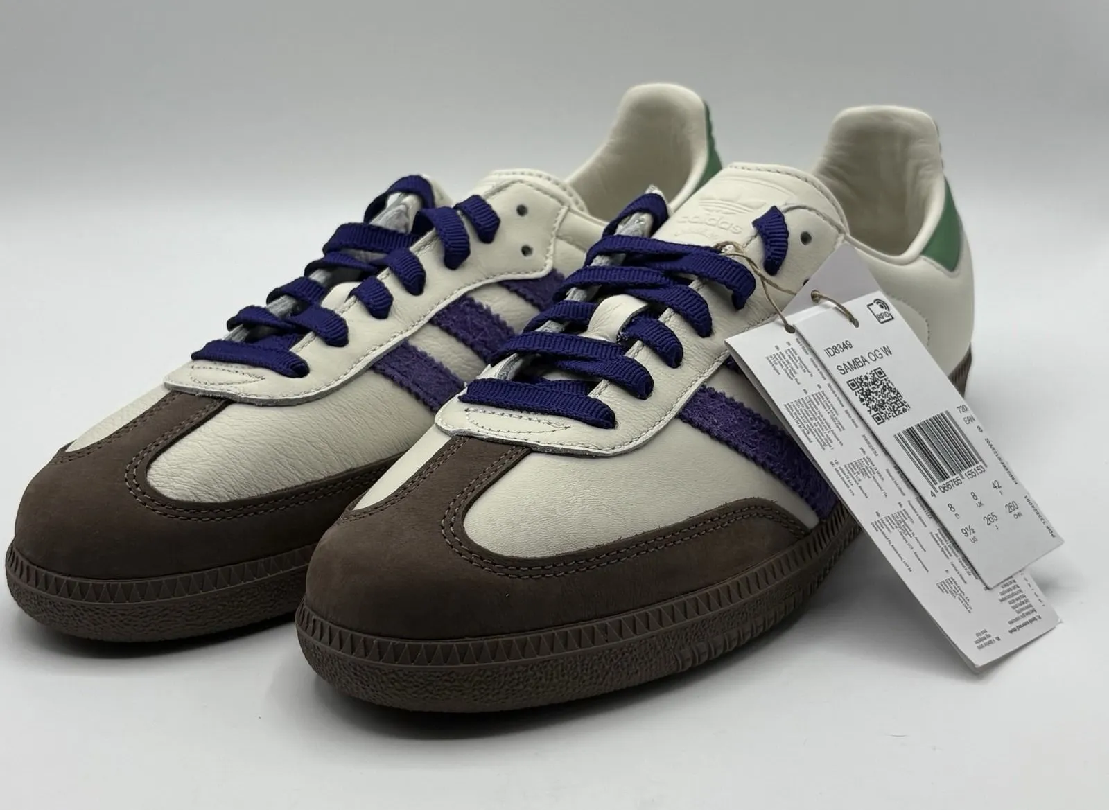 New without box The product is a pair of adidas Samba OG sneakers in an off-white, purple, and gre... Show more