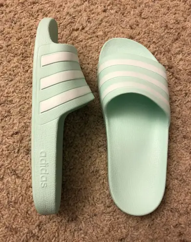 super cute teal adidas slides. worn a few times, only flaw is on the bottom of heels, as shown in pi... Show more