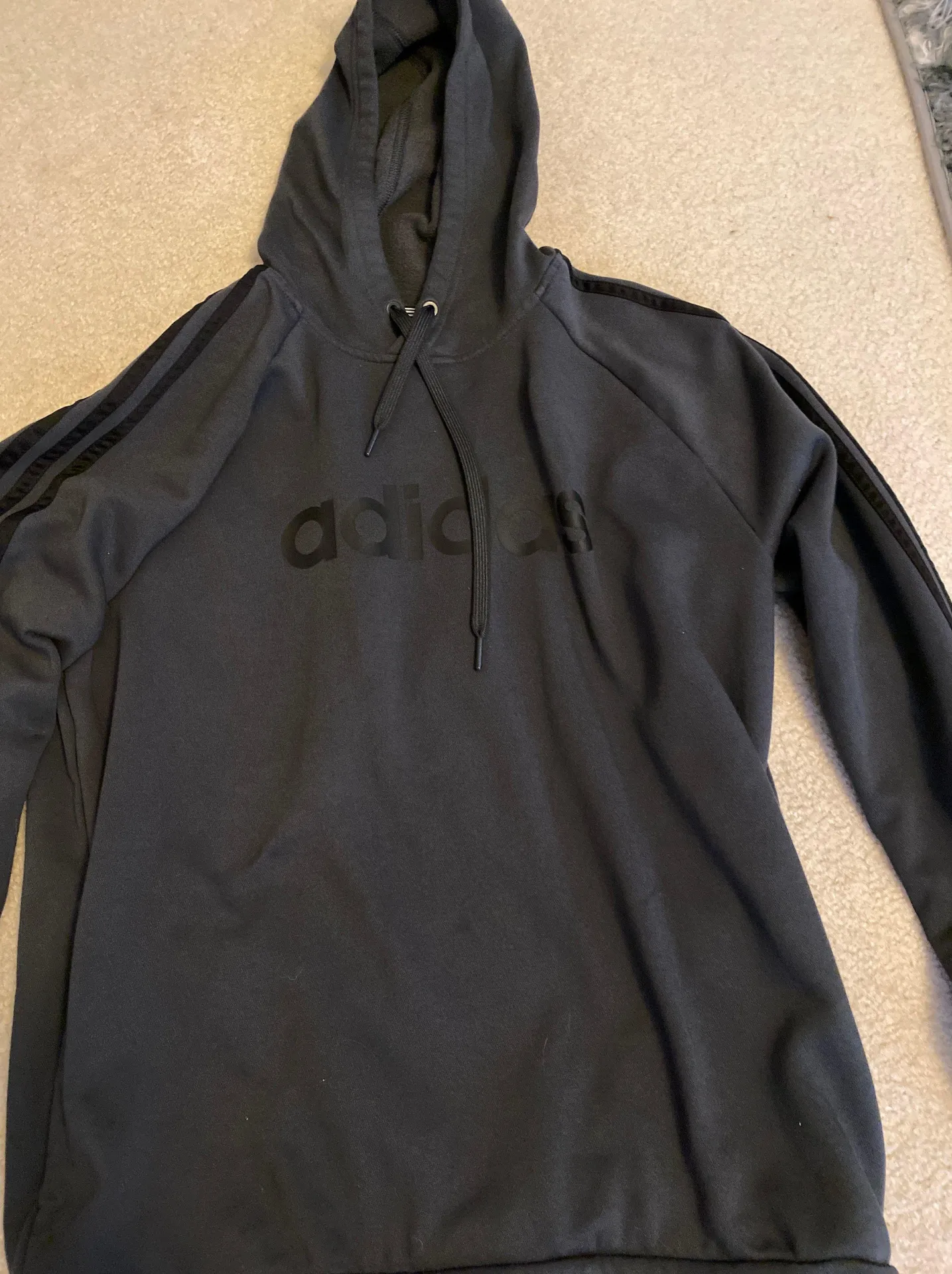 Dark grey w black stripes on arm sleeves. Men’s large but I like sweatshirts big on me so I got it f... Show more