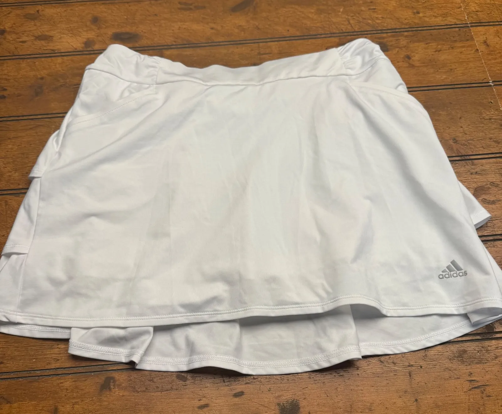 Adidas athletic tennis skirt in crisp white. This stylish skort features a flattering layered pleat... Show more