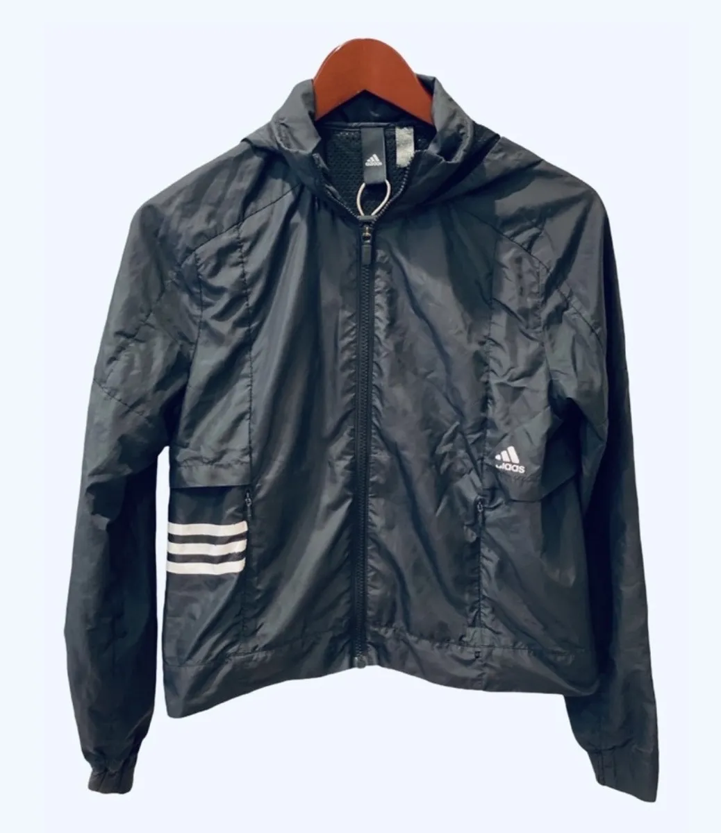 Well loved Adidas Windbreaker with attached hood. Signature three stripes on back and front. Adidas... Show more