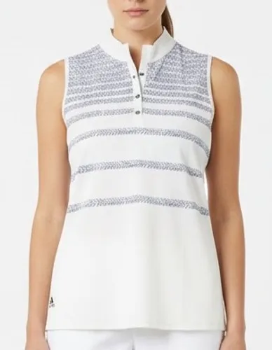 Adidas women's golf polo shirt in white with a striking blue chevron stripe pattern. This sleeveless... Show more