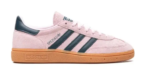 Adidas Spezial sneakers in soft pink. Dark blue stripes and gum sole add contrast. NEVER WORN BEFO... Show more