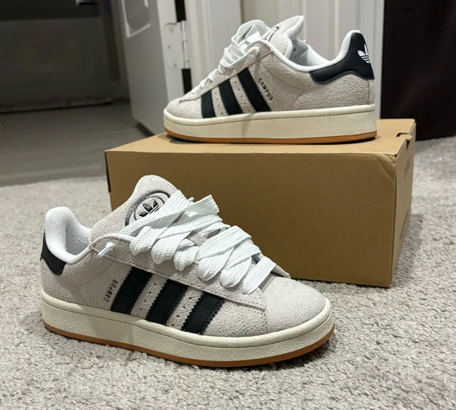 Adidas sneakers in white and black. Features a stylish gum sole. Ideal for everyday adventures.