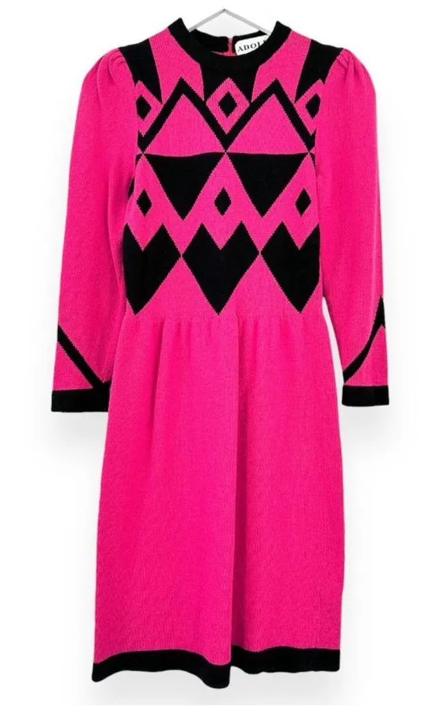 Vibrant pink dress with bold black geometric patterns. Long sleeves. Elegant and stylish design. Size tag missing—listing under Medium as an estimate but please review the measurements below Rare, stunning, statement vintage piece in majority wool fabric. · Geometric art print · Stretch knit 70% wool, 30% rayon. Has some stretch Approx measurements laying flat Pit to pit 15" Shoulders: 13" Sleeve Length: 22.25" Waist: 13" Hips: 17.25" Back Length: 37.5" Incredible vintage condition Freshly laundered Smoke free home Bright vibrant hot pink vintage Barbie mcm mid century modern Long sleeve dress