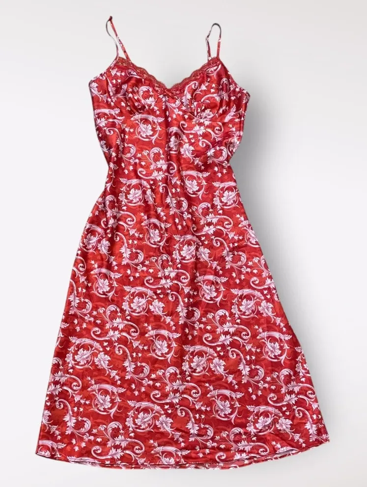 -Adonna Satin Floral Adjustable Maxi Slip Dress Womens Medium Red White Lace -Preowned in great con... Show more